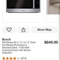 Bosch 500 Series 30 in. 2.1 cu. ft. Over-the-Range Microwave in Stainless Steel, 1100-Watt Cooking Power with Sensor Detection$399El Paso, TX