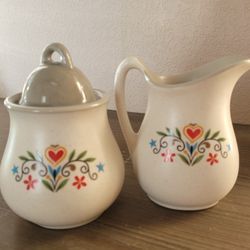 Vtg Harker Stoneware Early Morn Heart Sugar Bowl W Lid & Creamer Heart & Flowers$6El Paso, TX