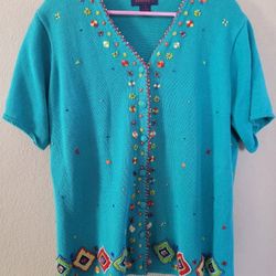 Beaded embroidered short sleeve cardigan sweater by Denim & Co. Floral Torquoise$14El Paso, TX