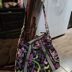 Vera Bradley 100% Cotton Hand Bag, 3 zippers, light weight, pretty, colors: bown,green,pink,purple.