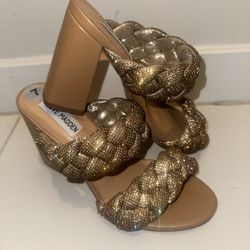 Steve Madden Nider Heels Tan Bronze Rhinestone Open Toe Block Heel Sz 7 Gold$60Fort Bliss, TX