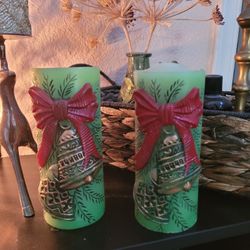 VTG 2 Green Christmas Bells Holiday Pillar Candles Red Bow. $5El Paso, TX