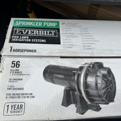 Everbilt 1hp Sprinkler system Pump 56GPM-BRAND NEW-Product Details Pumps 3360 GPH from pond/stream for lawn irrigation system Dual voltage motor can b$165Canutillo, TX