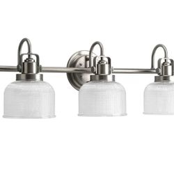 3386: [C3] Brand New Progress Lighting P2992-81 Archie Collection Clear Double Prismatic Glass Coastal Bath Vanity, 3-Light, Antique Nickel