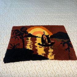 60s VTG Shag Needlework Boat Palm tree Sunset Background 34" x 24" MCM$20Fort Worth, TX