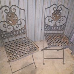 Wrought iron folding bistro chairs with decorative medallion backrest. From the late 19th to the early 20th century. $60Arlington, TX