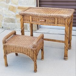 Vntg Boho Chic Wicker Rattan Bamboo Vanity Table Writing Desk & Stool