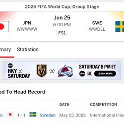 JAPAN V SWEDEN WORLD CUP 2 TICKETS $2,000Carrollton, TX