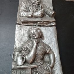 GORGEOUS Pair of Geschutzt Handarbeit Zin relief Pewter Wall Plaques