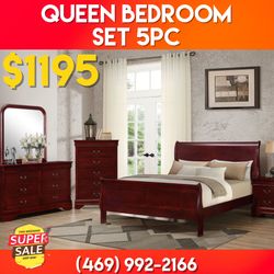 New In The Box 📦 Queen Cherry Bedroom Set 5pc ( Bed, Dresser, Mirror, Chest, Nightstand ) - Delivery And Financing Available $1,195Dallas, TX