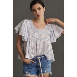 Anthropologie light Blue Striped Flutter Sleeve Embroidered Women’s Top xs$25Dallas, TX