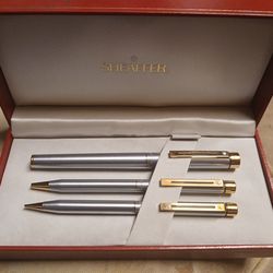 Vintage Sheaffer Targa Model 1001 Brushed chrome w/gold plated trim 3 piece mechanical pencil & 2 pen set.$50Euless, TX