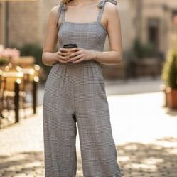 **New** Potter's Pot Gray Plaid Tie-Shoulder Wide-Leg Jumpsuit$16Houston, TX