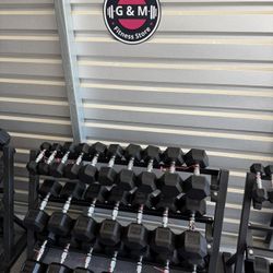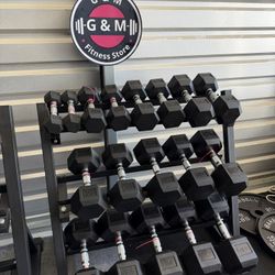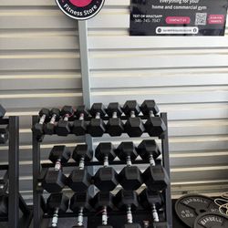 New pair of 10,15,20,25,30,35,40,45,50,55,60,70,80,90,100lb rubber dumbbell with commercial rack. $1945$1,945Houston, TX