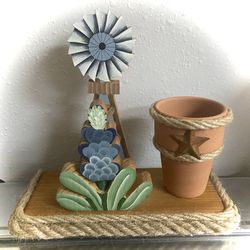 Windmill & Bluebonnet Wood Terracotta Succulent Planter Small Flowers$20Humble, TX