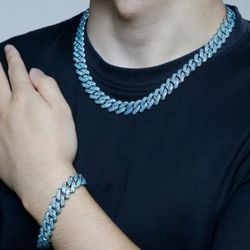 2-Pcs Iced Out 14K White Gold-Plated Turquoise Cubic Zirconia 20"Miami Cuban Chain Necklace & Bracelet Set$25Houston, TX
