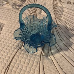 Fenton Art Glass basket, recognized by its signature blue color, ruffled edge, and unique handle$20Houston, TX