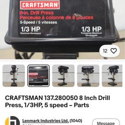 CRAFTSMAN 8 Inch Drill Press, 1/3HP, 5 speed – Parts$50Houston, TX