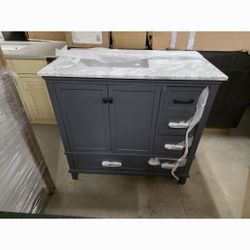 Merryfield 37 in. Single Sink Dark Blue-Grey Bath Vanity with White Carrara Marble Top (Assembled