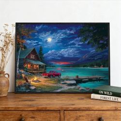 Lakefront Cabin Wall Art – 24x18 Inch Rustic Lake Scene with Vintage Truck & Campfire, Framed Canvas Print (Non-Lighted) for Living Room, Cabin & Farm$15Houston, TX