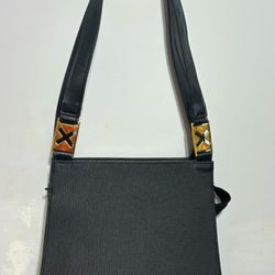 Unusual black rectangle purse hard with gold cut out x’s has sheen $25Houston, TX