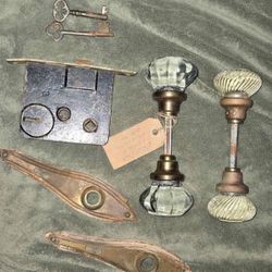 🏷️ Antique 1920s Glass Door Knob Set – Complete with Brass Backplates, Mortise Lock & Skeleton Keys$65Cypress, TX