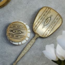 Vintage Antique Victorian Hand Mirror and Matson White Porcelain W/ Brass/Metal Lid Round Pouf Pumpkin Jewelry/Powder Trinket Box.