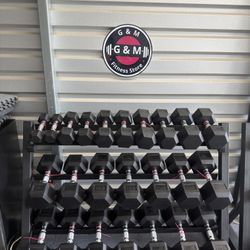 New pair of 10,15,20,25,30,35,40,45,50,55,60,70,80,90,100lb rubber dumbbell with commercial rack. $1945$1,945Houston, TX