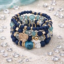 Multi-layer bohemian style bracelet set featuring rich royal blue and turquoise tones with handcrafted acrylic beads and metallic accents. Includes fo$8Harker Heights, TX