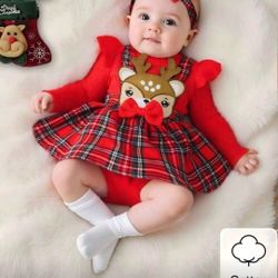Newborn Baby Girl Christmas Deer Plaid Suspender Skirt Set with Red Long Sleeve Bodysuit & Bow Headband $20Harker Heights, TX