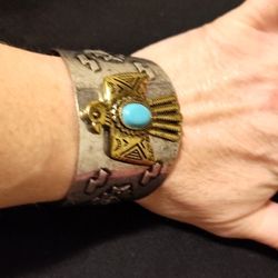 Silver And Gold Vintage Indian Cuff Bracelet With Faux Turquoise Stone And Eagle$40Harker Heights, TX