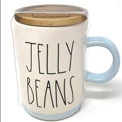 Rae Dunn Easter Ivory Blue Handle JELLY BEANS Mug with Wooden Lid/Coaster New$27Laredo, TX