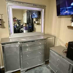 Luxury Mirrored Silver Bedroom Set – LED Upholstered Bed, Dresser, Mirror, Chest & 2 Nightstands$1,000Texarkana, TX
