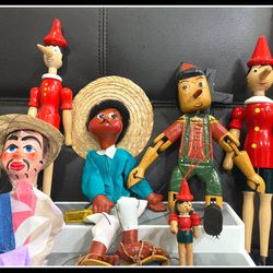 1 Vintage Pinocchio Wooden Jointed Doll Marionette Toy 12”. 2 VTG Mexican Marionette Puppet Sombrero String Doll 12” 3 RARE Antique Jointed Woode$60Desoto, TX
