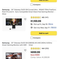 Samsung - 34" Odyssey OLED G8 Curved Ultra - WQHD 175Hz FreeSync Prem Pro and G - Sync Compatible Smart Glare Free Gaming Monitor - Silver$800San Juan, TX