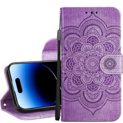 iPhone 14 Pro Case 5G 6.1-inch Card Holder Case Kickstand Flip Cover Embossed Mandala Flower Lanyard Protective Soft PU Leather Cover, Purple