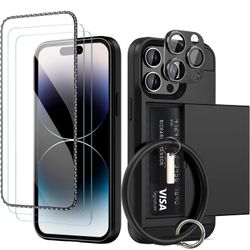 iPhone 14 Pro Max [7 in 1] Wallet Cover with Card Holder+Diamond Edge Screen Protector & 2PCS Tempered Glass Film+Camera Cover+Silicone Wrist Strap