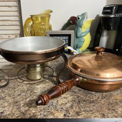 Vtg Globe-ware Copper/ Brass 5pcs Chafing Dish Pan Set w Wood Handle Double Boiler Fondue$40Midland, TX