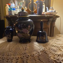 VINTAGE JAPANESE PEACOCK GINGER JAR WITH LID, PEACOCK BELL & BUD VASE SET$60Midland, TX