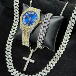 4-Pcs Men's Iced Out 14K White Gold-Plated Cubic Zirconia Wrist Watch With 24"Cuban Necklace +Bracelet & Cross Pendant $38Houston, TX