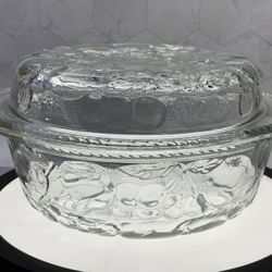(1) Beautiful LIBBEY Clear "3-IN-1" "Orchard Fruit" 3 Qt Casserole Dish with Pie Plate Lid. Excellent Condition. Manufactured between 1997 and 2001. $35Austin, TX
