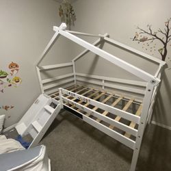 Kids twin size house shaped bed frame with slide and stairs$75Austin, TX