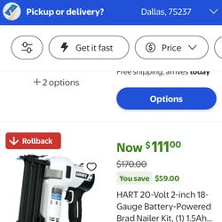 HART 20-Volt 2-inch 18-Gauge Battery-Powered Brad Nailer Kit, (1) 1.5Ah Lithium-Ion Battery$70Dallas, TX
