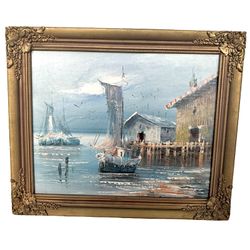 Vintage Oil Painting Sailboats By Dock Lake Ocean Sunset Artist Signed Gold Framed$244Lucas, TX