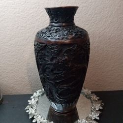 EXQUISITE 1940 Carved Black Chinese Cinnabar 10" Dragon Vase
