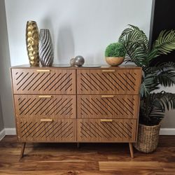 MODERN NORDIC 6 ROLLING DRAWERS DRESSER IN OAK COLOR AND GOLD KNOBS 50X17X38 NEW CONDITION $180Hickory Creek, TX