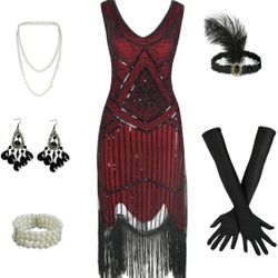NEW 1920s Gatsby Sequin Fringed Beaded Flapper Dress Cocktail Dress with Roaring 20s Accessories Set PRICE REDUCED! $30Forney, TX