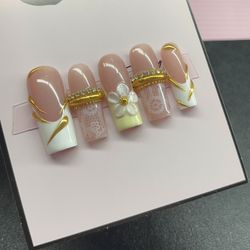 Long square Press on nails white French tips nude lace gold chrome flower 3d gel$45Beaumont, TX