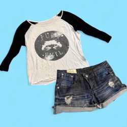 Graphic Scary Kitty Baseball Tee (small) + Distressed Denim Y2K Vintage Shorts (size 28")$15San Antonio, TX