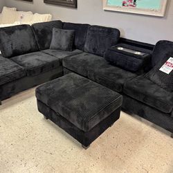 Black Corduroy Reversible Sectional With Cup Holder And Storage Ottoman. Brand New.$750San Antonio, TX